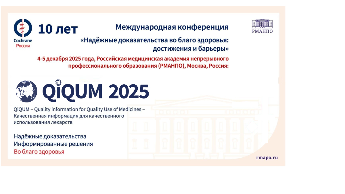Кокрейн Россия в Российской медицинской академии непрерывного профессионального образования (РМАНПО) Минздрава России совместно с другими членами Кокрейновского Сотрудничества, Редакционным советом Международного журнала по риску и безопасности в медицине, Коалицией за рациональное и безопасное использование лекарственных средств (CoRSUM), Ассоциацией клинических фармакологов Российской Федерации при участии Всемирной организации здравоохранения организуют Международную конференцию «Надёжные доказательства во благо здоровья: достижения и барьеры» (QiQUM 2025).